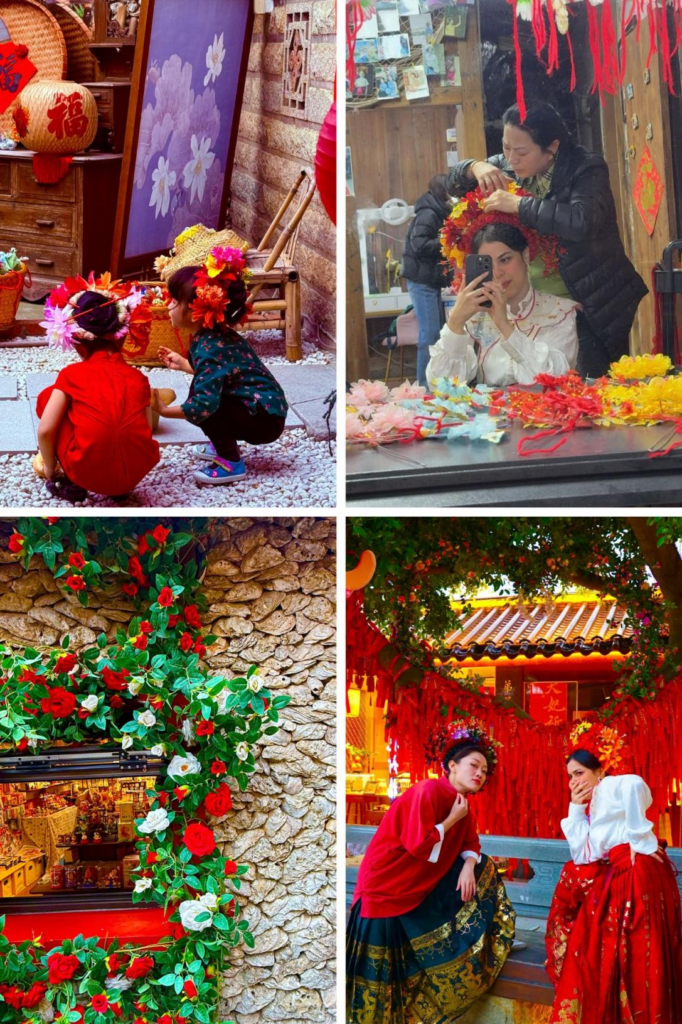 C’est leur beauté tranquille et leur résilience qui frappent quiconque croise leur chemin. Leurs mains, douces et patientes, nous ont habillées de leurs tenues traditionnelles Minnan, richement colorées et brodées, avant d’y déposer leurs célèbres couronnes florales Zanhuawei.