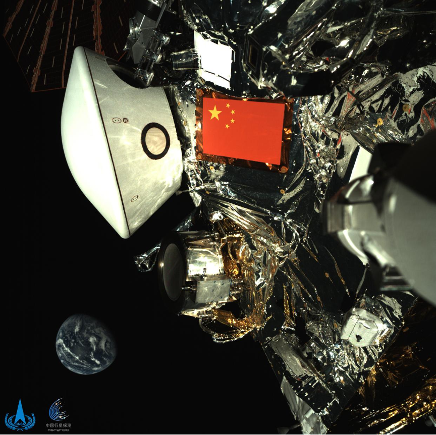 Cette nouvelle image, acquise par une caméra de surveillance montée sur le bras robotisé de la sonde, met en valeur le drapeau rouge à cinq étoiles de la Chine et la capsule de retour blanche sur fond de Terre bleue lointaine – un spectacle que les internautes ont affectueusement qualifié d’« instantané cosmique ».